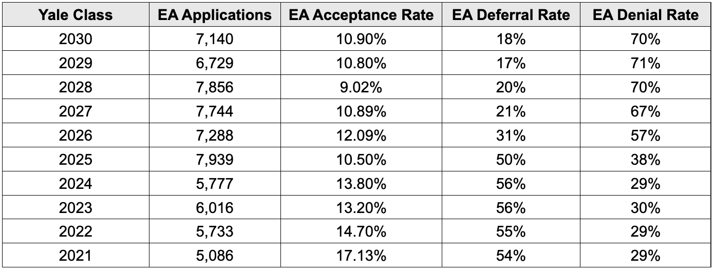 Up until about 2021, Yale routinely deferred more applicants than it denied. Early Action functioned as a broad holding round. But over the past several cycles, Yale has deliberately moved away from that approach.